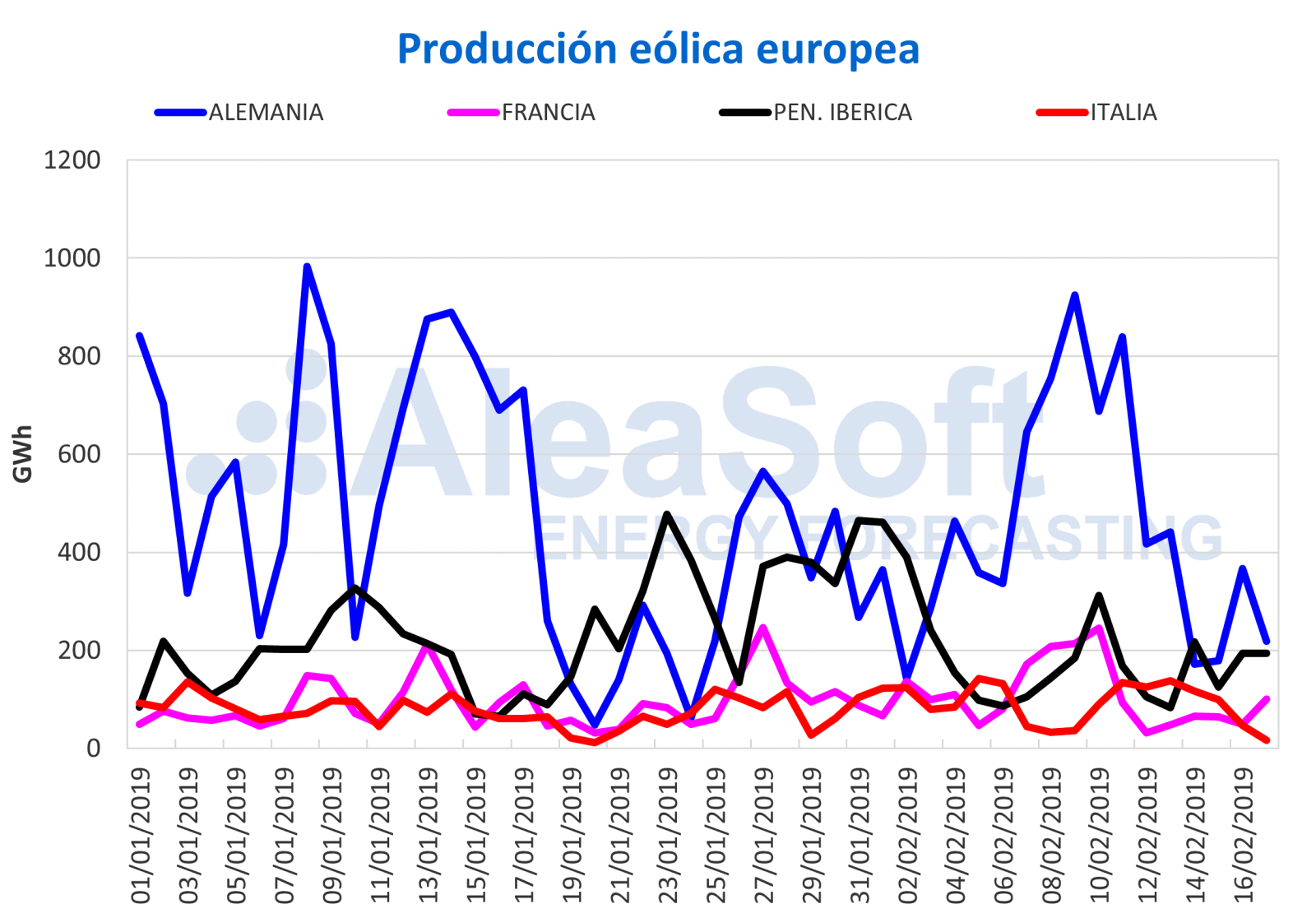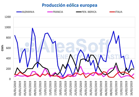Para la tercera semana de febrero lo más destacado en Europa en cuanto a producción eólica fue el descenso en Alemania de 1539 GWh si se compara la semana del 11 de febrero con la anterior pasando de una producción semanal de 4174 GWh a 2635 GWh. Para Alemania, en la semana entrante se estima una bajada similar de producción eólica, en torno a los 200 GWh, aunque los precios subirán solamente un 4%. En el conjunto de la Península Ibérica, España y Portugal, al igual que en Francia, los valores más altos de producción eólica se alcanzaron el 10 de febrero con 312 GWh y 245 GWh, respectivamente. Para la semana del 18 de febrero se espera que la producción eólica no sea tan alta.