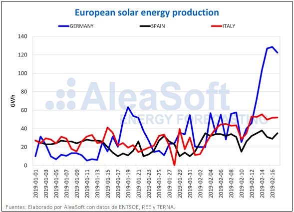 En el análisis realizado por AleaSoft relativo a la producción solar, que incluye tanto la fotovoltaica como la termosolar, se observa en Alemania un aumento de 325 GWh comparando las semanas del 4 de febrero con la semana posterior. Para la semana que entra se pronostica un aumento del 4%.