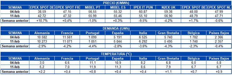 Los futuros de UK, Países Bajos y Bélgica en el mercado ICE también siguieron una senda bajista la semana pasada. Los futuros de UK para marzo de este año cerraron el viernes 15 de febrero en 50,52 GBP/MWh, unas 3 GBP/MWh más bajos que la semana anterior; los de los Países bajos cerraron ese mismo día en 45,48 €/MWh, con una diferencia de unos 4 €/MWh menos que la semana anterior; y los futuros de Bélgica cerraron en 45,73 €/MWh, también con una diferencia de unos 4 €/MWh menos respecto a la semana anterior.