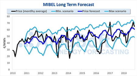 ¿Por qué una previsión de precio de mercado captado por la fotovoltaica de 10 €/MWh de promedio para todo 2030 no es realista? Está claro que con un precio así ninguna tecnología es rentable. Los mercados están diseñados para que se encuentre el equilibrio entre el precio que pagan los consumidores y el precio que reciben los productores y que sea beneficioso para ambos. Sólo hace falta observar la previsión a largo plazo del precio MIBEL que realizó AleaSoft a finales de 2010. Desde entonces, el precio del mercado ibérico ha ido oscilando por las condiciones específicas de cada año, pero el precio promedio anual se ha mantenido alrededor de un punto de equilibrio entre los 45 y 55 €/MWh.