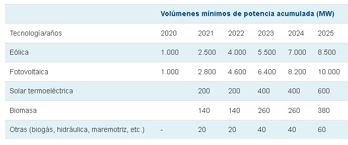 En el año 2020 se convocarán subastas para la asignación de régimen económico de energías renovables para un mínimo de 3.000 MW, de los que al menos 1.000 MW se destinarán a energía eólica; 1.000 MW a fotovoltaica, quedando el resto de potencia a subastar sin restricción tecnológica.