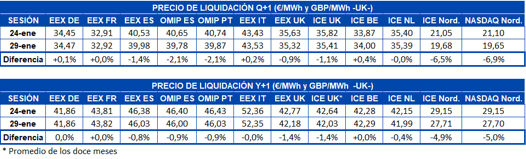 El panorama en los precios de los futuros para el año calendario 2021 de los mercados europeos fue idéntico al registrado para el segundo trimestre de 2020. En este caso, las variaciones en los precios de cierre del miércoles 29 de enero se han mantenido en el rango del ââ?¬â??1,4% al 0,0% de diferencia en comparación con el viernes pasado. Lo anterior no aplica para los mercados ICE y NASDAQ de los países nórdicos, que continuaron en la senda bajista y cerraron un 5,0% más bajos que en la sesión del viernes 24 de enero.