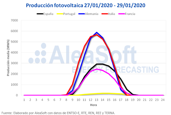 En los primeros tres días de esta semana la producción solar media en la península ibérica fue un 34% superior al promedio de la semana anterior. En Italia el aumento respecto a la semana pasada fue del 13%. En cambio, en Francia la producción solar fue similar en promedio a la de la semana pasada. Mientras que, en Alemania, el promedio de los tres primeros días de esta semana fue un 24% inferior al promedio de la semana pasada.