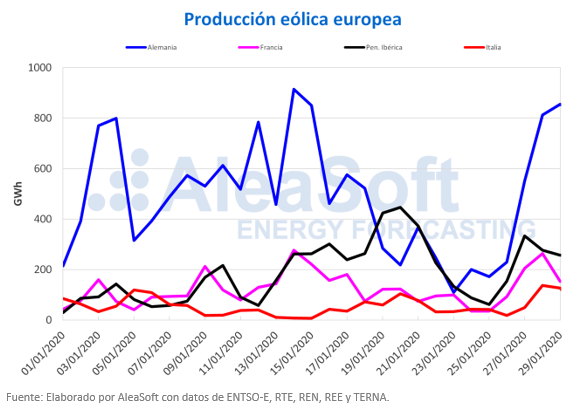 En lo que va de enero de 2020 la producción eólica descendió un 26% en Italia y un 17% en la península ibérica. En Alemania, subió un 1,2% y en Francia el incremento fue del 36%.