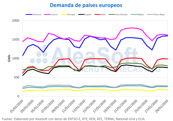 La demanda eléctrica descendió los primeros tres días de esta semana respecto a los mismos días de la semana anterior en la mayor parte de los países analizados, exceptuando Alemania y Portugal, donde aumentó un 2,8% y 0,4% respectivamente. En el resto de países los descensos estuvieron entre el 8,8% de Francia y el 1,1% de Italia. Durante el resto de la semana se espera que la demanda continúe descendiendo debido a las temperaturas que serán menos frías y al efecto del fin de semana. La próxima semana se espera que la demanda aumente con el descenso de las temperaturas a partir del próximo martes.