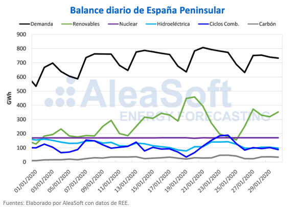 La producción solar media de España, que incluye a la fotovoltaica y a la termosolar, aumentó en 5 GWh de lunes a miércoles de esta semana respecto a la media de la semana anterior, lo que representó un incremento del 42%. Por lo que respecta a la variación interanual registrada en los primeros 29 días del mes de enero, el incremento fue del 5,6%.