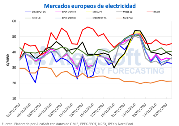 En AleaSoft se prevé que en los días restantes de esta semana los precios de la mayoría de los mercados europeos continuarán bajando debido a una menor demanda y temperaturas menos frías durante el fin de semana. Para la próxima semana se espera que los precios aumenten, debido a que descenderán nuevamente las temperaturas, lo que conllevará un aumento de la demanda eléctrica en la mayoría de los mercados. No obstante, se espera que la semana próxima los precios no lleguen al nivel de la semana del 20 de enero en la que varios días los precios rondaron los 50 €/MWh.