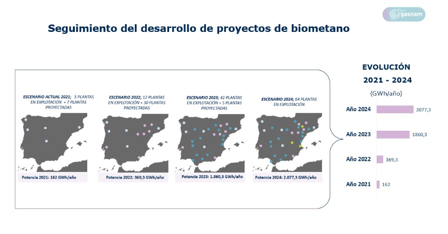 Según la información disponible en la web de GASNAM, antes de que acabe 2022, habrá 12 plantas de biometano en explotación en España y estarán en proyecto otras 30. Y las previsiones para 2024 arrojan la cifra de 64 plantas de biometano en explotación, que generarán una potencia total de 2.077 Gwh/año frente a los 162 GWh/año actuales.