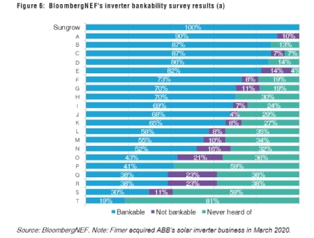 En la investigación realizada por BloombergNEF en el sector de la energía solar, podemos encontrar hasta 32 referencias a bancos, fondos de inversiones, contratistas de ingeniería solar, productores de energía independientes y asesores técnicos. Este informe evalúa la capacidad del fabricante en cuanto a los recursos desplegados en campo, el estado financiero de la compañía, el soporte y servicio local, las garantías y especificaciones técnicas; como principales indicadores para las entidades financieras a la hora de conceder un crédito comercial o para los promotores a la hora de elegir de la marca del inversor.