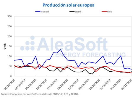 En el mes de octubre de este año, la producción solar de España, que incluye a la fotovoltaica y a la termosolar, aumentó un 29% interanual. Otro mes más, la producción mensual de 2019 en España se ha mantenido por encima de la de los mismos meses de 2018, salvo en el mes de julio. Italia y Alemania tuvieron variaciones en direcciones opuestas: en el primero subió un 12% mientras que en el segundo disminuyó un 12% en términos interanuales.