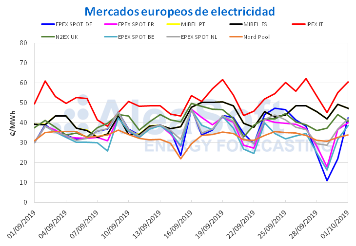 En el mes de septiembre recientemente finalizado, aunque la mayoría de mercados presentaron leves bajadas en su precio medio mensual respecto al mes anterior, los mercados EPEX SPOT de Francia e IPEX de Italia mostraron subidas de 6,4% y 3,3% respectivamente. Es este último mercado, el italiano, el que ha resultado el de mayor precio durante el mes de septiembre, con un valor medio de 51,18 €/MWh. Por otro lado, el mercado Nord Pool, que ha presentado el mayor descenso entre los mercados analizados, de 8,5%, ha vuelto a posicionarse como el mercado con el precio medio más bajo de Europa, cosa que no consiguió en el mes de agosto.
