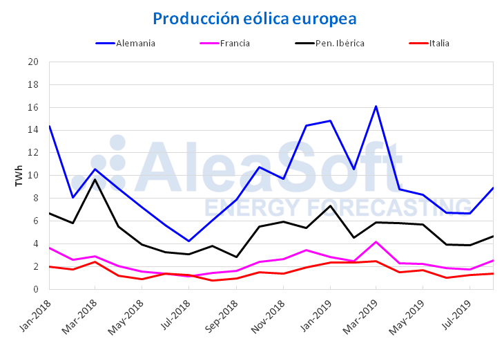 En el mes de septiembre hubo una subida generalizada de la producción eólica en gran parte del continente europeo, donde varios países tuvieron subidas de más del 40% en términos interanuales. Estos aumentos fueron encabezados por Portugal, donde la producción se duplicó y marcó un incremento del 112%. Esta racha de subidas que comenzó en Portugal en abril de 2019, se ha mantenido cada mes con una producción mensual interanual superior a la de 2018. Otra subida a destacar fue la de Francia, de un 60%, siendo el séptimo mes consecutivo de este año con valores por encima de los de 2018, con subidas superiores al 37% en cinco de estos meses. El aumento fue del 32% en el conjunto de los países analizados. De manera similar, la producción aumentó el mes pasado respecto a agosto de 2019 en todos los países analizados.