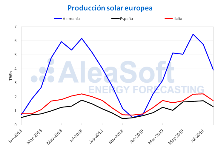 Similarmente, los tres trimestres de 2019 han tenido mayor producción solar que los correspondientes de 2018 en España. Para el trimestre que comenzó en julio de 2019 la subida fue del 6,6%. También subió en Italia un 2,2% en el tercer trimestre de este año, mientras que en Alemania bajó un 2,9%.