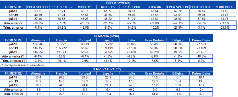Lo mismo ocurre cuando se analiza el tercer trimestre de 2019 respecto a su homólogo de 2018. Las diferencias interanuales presentan bajadas del precio medio de entre el 25,9% y el 42,3%. El mercado que más cambio presentó fue el EPEX SPOT de Bélgica, mientras que el mercado IPEX de Italia fue el de menor variación interanual. Es precisamente este mercado italiano el de mayor precio durante el penúltimo trimestre del año en curso, con una media de 51,01 €/MWh.