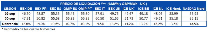Si se analiza el comportamiento durante el mes de septiembre, los futuros de electricidad para el año 2020 se recuperaron con una subida generalizada en comparación con el primer cierre de este mes, el día 2 de septiembre. Se debe destacar que durante este período, estos mercados se vieron afectados por la incertidumbre sobre la oferta tras una deficiencia en una planta nuclear francesa que provocó una fuerte subida en los precios. En la medida que el temor generalizado se fue aplacando, los precios retomaron una tendencia a la baja, pero ayer lunes 30 de septiembre continuaban por encima de los valores registrados los primeros días de este mes. De todos, los mercados menos afectados fueron los de EEX para España y OMIP para España y Portugal.