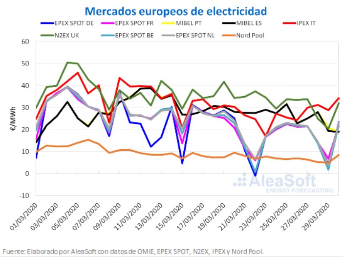 Durante la pasada semana del 23 de marzo se produjo una bajada generalizada en los precios de los mercados eléctricos en Europa. Específicamente, el sábado 28 de marzo se registró el precio más bajo de al menos los últimos dos años en el mercado N2EX de Gran Bretaña, el mercado EPEX SPOT de Países Bajos y el mercado Nord Pool de los países nórdicos, con precios de 20,37 €/MWh, 3,69 €/MWh y 5,02 €/MWh respectivamente. Para este lunes 30 de marzo, el mercado de los países nórdicos cerró con un precio promedio de 8,49 €/MWh. De esta forma cuentan ya 20 días consecutivos con un precio inferior a los 10 €/MWh en este mercado.