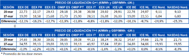 Los precios de los futuros de electricidad para el segundo trimestre de 2020 volvieron a cerrar la semana pasada con una caída generaliza en comparación con la semana anterior. Al cierre del pasado viernes 27 de marzo se continuó notando en los futuros para el próximo trimestre los efectos de la crisis del coronavirus. Los mayores descensos se registraron en los mercados ICE y NASDAQ de los países nórdicos, con caídas del 25% respecto al viernes anterior. El resto de los mercados presentaron también importantes variaciones, desde el 16% experimentado en los mercados EEX de Francia e ICE de Bélgica, hasta el 6,8% registrado en el mercado EEX para Italia.