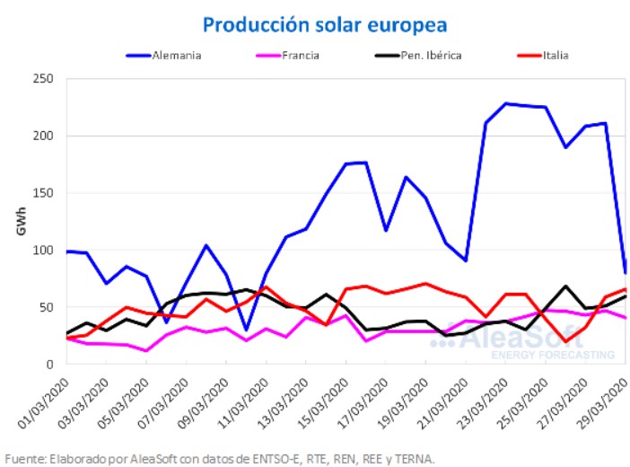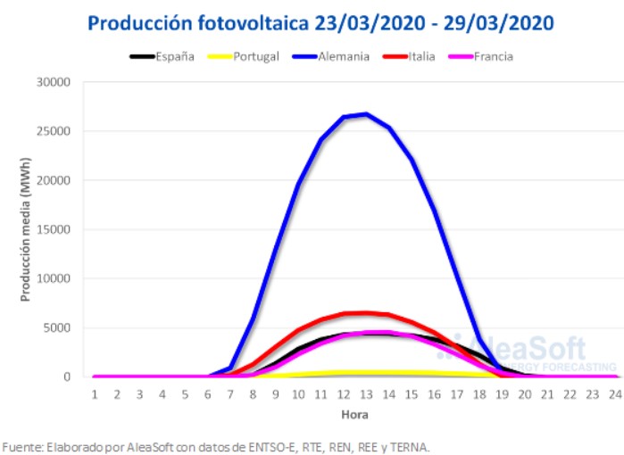 Durante la semana del 23 de marzo la producción solar se incrementó respecto a la semana del 16 de marzo en la mayoría de los mercados eléctricos de Europa, salvo en el caso del mercado italiano. La generación con tecnología solar aumentó un 35% en Alemania, donde el 23 de marzo se alcanzó la máxima producción diaria en lo que va del primer trimestre del año, cuyo valor fue de 228 GWh. También se registró el máximo diario para los primeros tres meses del año en Portugal, donde se registró una producción de 4,5 GWh el día 26 de marzo. El aumento semanal en Portugal fue del 31%. El mercado de España tuvo el mayor incremento en la producción con esta tecnología, del 55%. La bajada registrada en Italia fue del 21%.