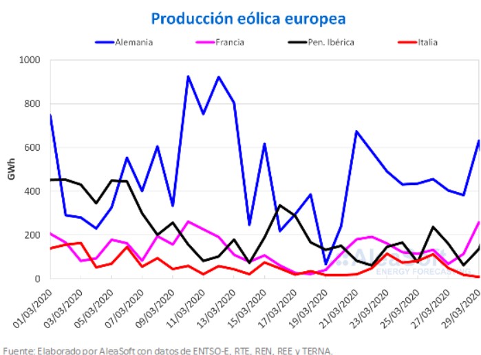 Del 1 al 29 de marzo la producción eólica sufrió disminuciones en gran parte de los mercados europeos. En Italia la caída fue del 21%, mientras que la de Alemania fue del 12%. En la península ibérica se tuvo un incremento del 11%.