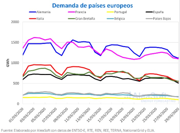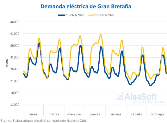 La demanda del mercado de Gran Bretaña tuvo los mayores cambios durante la semana pasada, cayendo un 13%, como consecuencia de la instauración del confinamiento de sus ciudadanos el pasado lunes 23 de marzo para frenar la propagación del coronavirus. A partir del martes 24 fue cuando más se apreciaron los cambios en la demanda, entre los que se encuentran la disminución del consumo durante las horas laborables y el aumento después de las 18 horas.