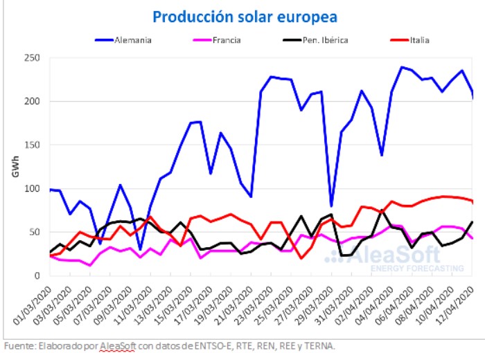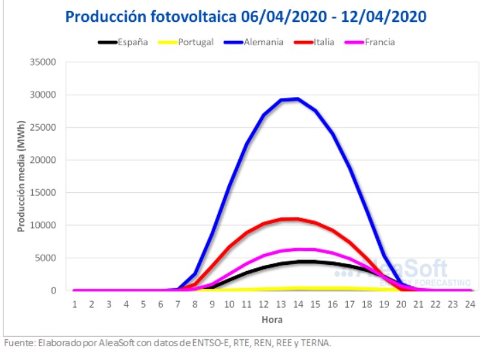 La producción solar aumentó la semana pasada, que comenzó el 6 de abril, en la mayoría de los mercados analizados en AleaSoft en comparación con la semana anterior. En el mercado italiano y el alemán los incrementos fueron de un 20% y un 17% respectivamente. En Portugal se registró un aumento de un 5,8% mientras que en España la producción con esa tecnología disminuyó un 4,1%.
