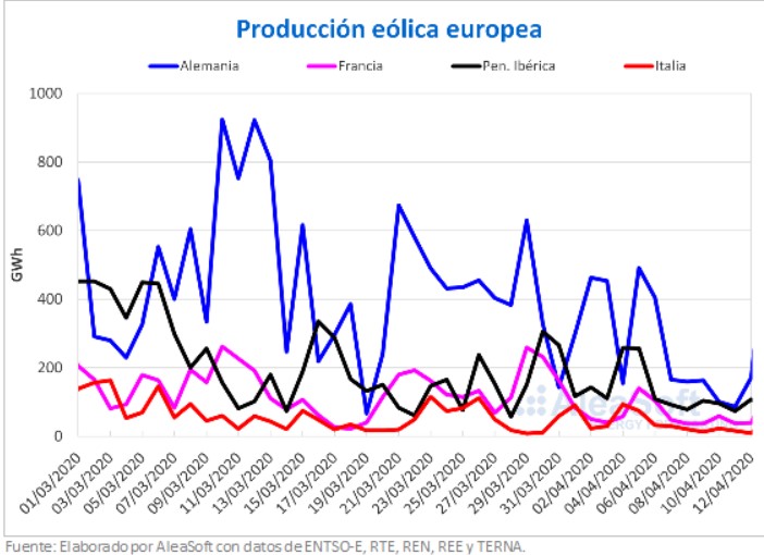En lo que va del mes de abril, hasta ayer día 12, también se evidenció una disminución en la producción eólica en comparación con igual período de 2019 en la mayoría de los mercados europeos. Los casos que más se destacan son los de la península ibérica y el de Italia que disminuyeron un 39% y un 16% respectivamente. Por el contrario en Alemania aumentó un 5,4%.