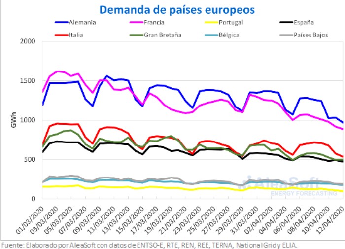 Aún cuando la demanda eléctrica ha ido disminuyendo desde hace varias semanas a causa de las medidas de confinamiento por el nuevo coronavirus, y que en casos como España la demanda eléctrica cayó hasta niveles vistos hace más de 15 años, esta Semana Santa se produjeron descensos nuevamente. De hecho, la demanda tuvo variaciones intersemanales mayores a las registradas en 2019 en casi todos los mercados europeos. Las excepciones fueron los mercados de España e Italia, donde los descensos fueron menores a los de la semana del 15 al 21 de abril de 2019. Coincide con que en estos dos casos desde hace varias semanas se han tomado medidas muy restrictivas que han disminuido la laboralidad de forma importante.