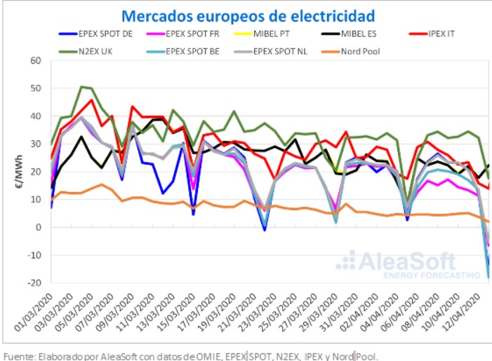 Este lunes 13 de abril los precios han disminuido respecto a los de ayer en todos los mercados europeos, excepto en el mercado MIBEL, donde han aumentado coincidiendo con el regreso al trabajo en las actividades no esenciales en algunas regiones de España. En el caso de los mercados EPEX SPOT de Bélgica, Alemania, Suiza, Francia y los Países Bajos, se han registrado precios promedio diarios negativos de 17,95 €/MWh, de 15,97 €/MWh, de 6,95 €/MWh, de 6,51 €/MWh y de 5,45 €/MWh respectivamente.