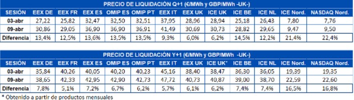 En el caso de los precios de los futuros de electricidad para el año 2021 ocurrió algo muy similar. Se registraron incrementos en todos los mercados analizados con respecto a la sesión del 3 de abril, protagonizados por los países nórdicos, tanto en el mercado NASDAQ como en el mercado ICE con aumentos del 17% en cada caso. El mercado EEX de Francia fue el de menor aumento del precio de este producto, con un 5,1%.