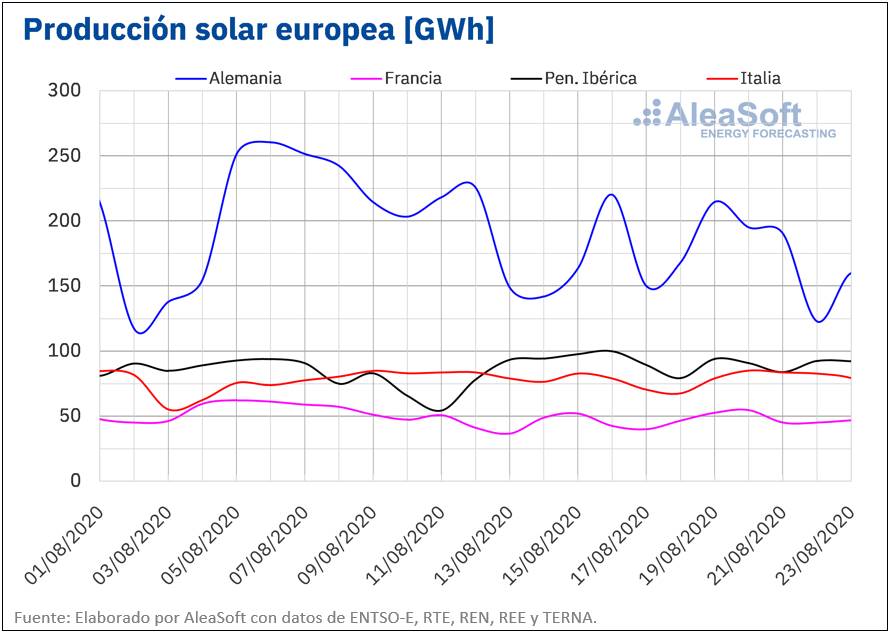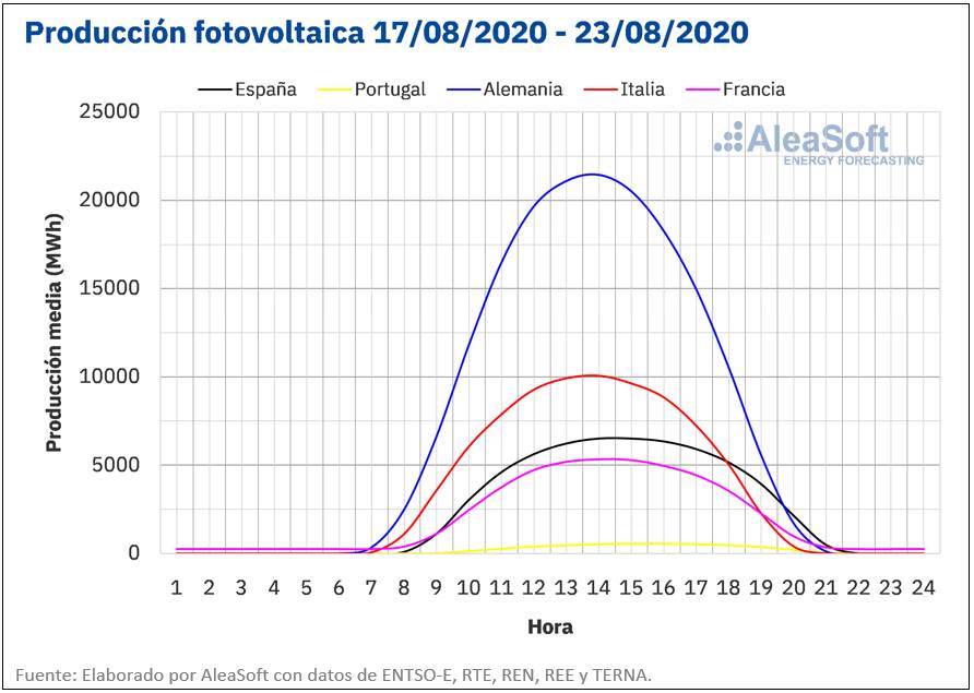 La producción solar durante la semana del lunes 17 de agosto aumentó un 7,1% en el mercado español y un 3,7% en el mercado francés. Por el contrario en el mercado alemán disminuyó un 9,2%, mientras que en los mercados de Italia y Portugal la producción descendió un 3,5% y un 2,5% respectivamente.