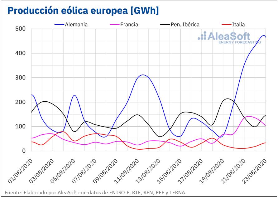 Entre el 1 y el 23 de agosto, la producción eólica disminuyó entre un 19% y un 12% en los mercados de Portugal, Alemania y Francia en comparación con los mismos días de agosto de 2019. Por el contrario, en el mercado español aumentó un 16% y en el mercado italiano un 19%.