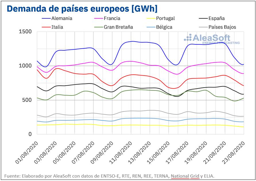 Durante la semana del 17 de agosto la demanda eléctrica descendió en la mayoría de los mercados europeos respecto a la segunda semana del mes. La bajada de la demanda se debió fundamentalmente al descenso de las temperaturas durante la tercera semana de agosto tras finalizar la segunda ola de calor del verano. Dichos descensos estuvieron entre el 0,2% y el 7,7%. Las excepciones fueron los mercados de España e Italia donde las temperaturas fueron en general similares y la demanda se incrementó un 0,9% y un 1,6% respectivamente