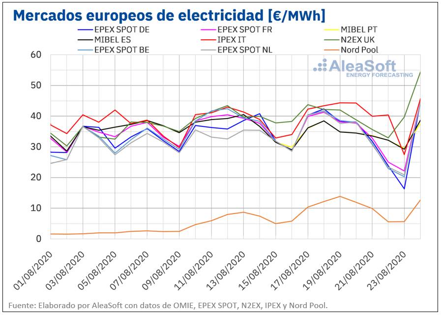En cambio, el domingo 23 de agosto, los precios fueron inferiores a 30 €/MWh en casi todos los mercados. La excepción fue el mercado N2EX, que tuvo un precio diario de 39,73 €/MWh. Ese día, los precios más bajos fueron los del mercado Nord Pool y el alemán, de 5,65 €/MWh y 16,33 €/MWh respectivamente.