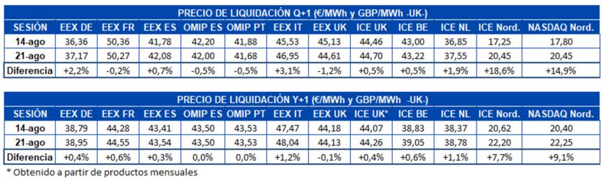 Durante la semana del 17 de agosto, los precios de los futuros de electricidad para el próximo trimestre registraron un comportamiento mayoritariamente al alza respecto al cierre de la semana del 10 de agosto. Las excepciones fueron el mercado EEX de Gran Bretaña y Francia y el mercado OMIP de España y Portugal, donde los precios descendieron un 1,2% en el mercado británico, un 0,2% en el francés y un 0,5% en los de la península ibérica. El resto de los mercados registraron subidas que fueron desde el 0,5% del mercado ICE de Gran Bretaña y Bélgica hasta el 19% en el mismo mercado para los países nórdicos. En España y Gran Bretaña se registraron comportamientos dispares entre los diferentes mercados de esas regiones. Para España, los precios aumentaron en el mercado EEX mientras que en el mercado OMIP disminuyeron. En el caso de Gran Bretaña, los precios disminuyeron en el mercado EEX mientras que aumentaron en el mercado ICE.