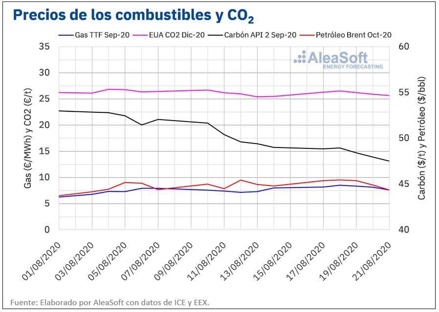 En cuanto a los futuros de derechos de emisión de CO2 en el mercado EEX para el contrato de referencia de diciembre de 2020, alcanzaron el precio de cierre más elevado de la tercera semana de agosto, de 26,54 €/t, el martes 18 de agosto. Posteriormente, los precios descendieron hasta alcanzar el viernes 21 de agosto un precio de cierre de 25,65 €/t.