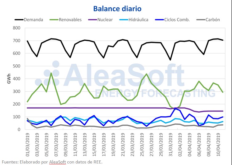 La producción nuclear ha bajado respecto a la semana pasada, un 15% en lo que llevamos de semana, ya que la central nuclear de Vandellós II ha iniciado una parada no programada en la tarde del pasado 4 de abril pues se detectaron problemas en una válvula, según ha informado el Consejo de Seguridad Nuclear (CSN). Esta parada tiene un origen similar a la que sufrió esta central el 18 de diciembre del año pasado. En aquella ocasión la central volvió a estar totalmente operativa el 5 de enero de este año, después de 18 días desde su desconexión.