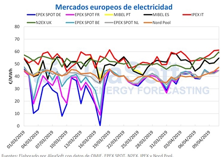 Los mercados europeos continúan distribuidos según su precio en dos grupos. En el grupo de mercados con precios más bajos, que esta semana han estado alrededor de los 44 €/MWh, y que desde mediados de marzo están muy alineados, se encuentra el mercado EPEX SPOT de Alemania, Francia, Bélgica y los Países Bajos y el mercado Nord Pool de los países nórdicos. Y en el grupo de mercados con precios más altos, abarcando una franja de precios más amplia, esta semana desde los 50 €/MWh a los 61 €/MWh, se encuentran los mercados MIBEL, N2EX e IPEX.