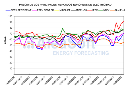 En los mercados EPEX SPOT Francia y Alemania/Austria el precio medio del 13 de septiembre es el más alto de un septiembre de la última década. El precio de ese día en el mercado francés fue 71,10 €/MWh y el del mercado Phelix 71,52 €/MWh.