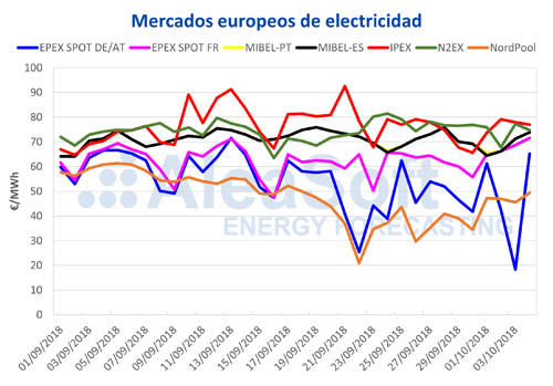 En estos últimos días, los precios de los principales mercados eléctricos europeos se han agrupado en la banda alta, entre los 70 y 80 €/MWh. La excepción han sido los países nórdicos, que continúan en su puesto privilegiado de precios más bajos de Europa, y Alemania, que además de tener un día festivo, y consecuentemente menos demanda, también ha disfrutado de una alta producción eólica.