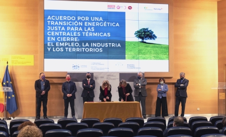 La vicepresidenta cuarta del Gobierno y ministra para la Transición Ecológica y el Reto Demográfico, Teresa Ribera; la ministra de Trabajo y Economía Social, Yolanda Díaz; el secretario general de CCOO Industria, Agustín Martín; el secretario General de UGT FICA, Pedro L. Hojas; el consejero delegado de EDP España, Rui Teixeira; el consejero delegado de Endesa, José Bogas; la consejera delegada de Iberdrola España, Ángeles Santamaría y el presidente ejecutivo de Naturgy, Francisco Reynés, han participado hoy en el acto de adhesión del grupo energético EDP al “Acuerdo por una Transición Energética Justa para las centrales térmicas en cierre: el empleo, la industria y los territorios”, alcanzado el 17 de abril de 2020. Con la suma de esta compañía el acuerdo incorpora ya a todas las centrales térmicas de carbón de España, lo que le convierte en un pacto único en el mundo por el grado de consenso alcanzado.