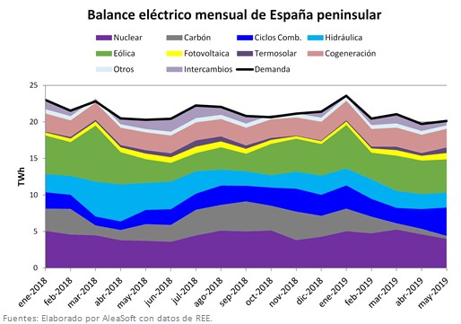 Según los datos publicados por REE, durante el mes de mayo la eólica fue la tecnología que más produjo, cubriendo el 23,4% de la demanda y con un incremento del 40% respecto a mayo del año pasado, seguida de la producción nuclear, que cubrió un 20,5% de la demanda, y de los ciclos combinados, con una cuota de 20,1% en el mix eléctrico español y con un incremento interanual de su producción de un 99%.