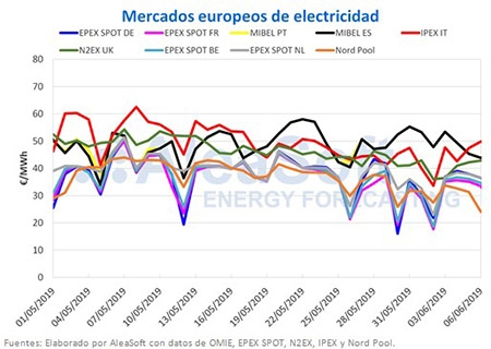 En el grupo de mercados con precios más bajos se encuentran los mercados EPEX SPOT de Alemania, Francia, Bélgica y Países Bajos, en general muy sincronizados, y el mercado nórdico Nord Pool. Estos mercados estuvieron la mayor parte del mes de mayo oscilando alrededor de 40 €/MWh y desde finales de mes y en lo que va de junio se encuentran por debajo de 40 €/MWh. En mayo el mercado EPEX SPOT Francia fue el de menor precio de Europa, con 37,21 €/MWh, y en lo que va de semana, entre el 3 y el 6 de junio, el mercado Nord Pool, con 30,45 €/MWh.