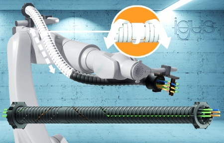 Para garantizar que los cables de los robots industriales pueden guiarse de forma segura, fácil y compacta, igus ha desarrollado la cadena portacables triflex TRX para movimientos en cuatro dimensiones. El nuevo diseño de prueba sustituye a los clásicos paquetes energéticos y sistemas de retracción para robots. Su característica especial es un 40% de longitud de retracción garantizada por un mecanismo telescópico único dentro de la cadena, que permite a los usuarios ahorrar espacio en el tercer eje de su robot, hasta un 83% de peso y los elevados costes de los sistemas de retracción.