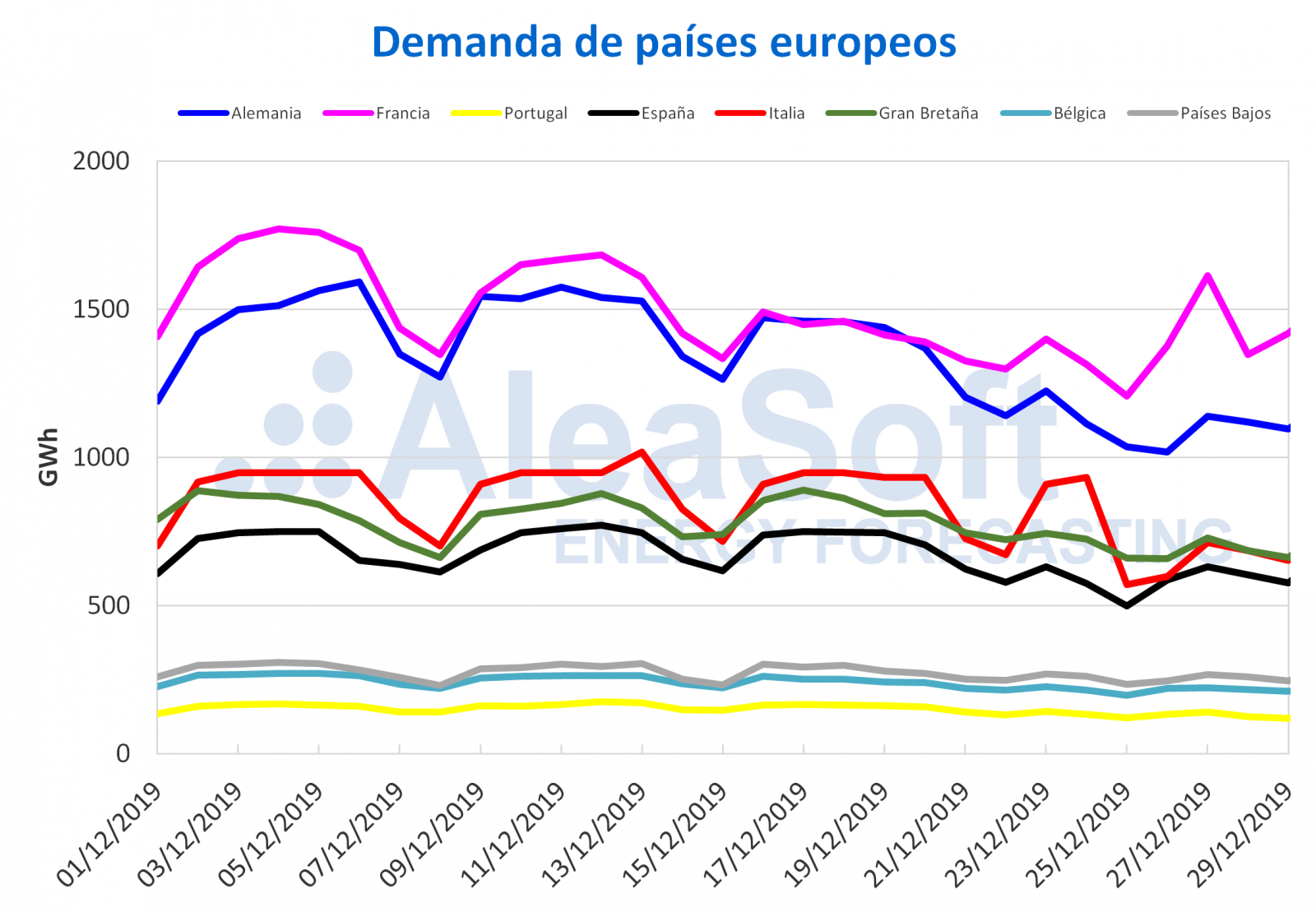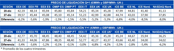 Como era de esperar, en la semana recién concluida la demanda eléctrica ha estado muy por debajo de la obtenida en la semana anterior en todos los mercados del continente europeo. El efecto de laboralidad de los festivos del 25 y 26 de diciembre ha causado en Alemania e Italia descensos del 19% y 17%, respectivamente. Las temperaturas medias fueron, en general, al menos 1 °C más bajas que las de la semana anterior, pero tuvieron menos influencia que el efecto de laboralidad. En Portugal la disminución fue del 16% al igual que en España. Al corregir el efecto de laboralidad en Alemania, Francia y España, se obtienen aumentos respecto a la semana del 16 de diciembre del 5,7%, 2,4% y 0,2% respectivamente.