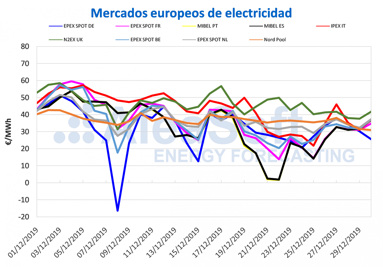 Para este lunes 30 de diciembre el mercado EPEX SPOT de Alemania ha sido el de menor precio, con un promedio diario de 25,57 €/MWh, donde se espera una mayor producción eólica y una temperatura más cálida. Mientras que el mercado británico, con un promedio de 41,69 €/MWh para este día, continúan siendo el de mayor precio. El resto de los mercados han cerrado con precios entre los 30,95 €/MWh del mercado de los países nórdicos y los 37,29 €/MWh del mercado de Países Bajos.