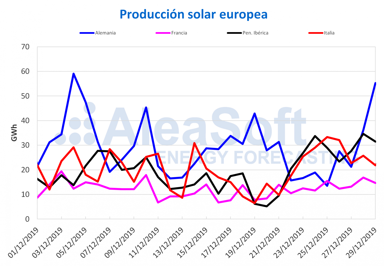 Faltando solo dos días para terminar diciembre, la producción solar de este mes ha sido mayor en la mayoría de los mercados respecto al mismo período de 2018. En Alemania el aumento ha sido de un 68% y en la península ibérica de un 10%. Sin embargo, en Italia a pesar del gran aumento semanal, ha disminuido en un 8,8%. Para esta semana, en AleaSoft se esperan caídas de la producción solar en España e Italia, y aumentos en Alemania.