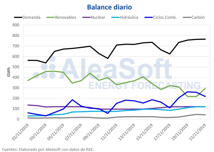 La producción con otras tecnologías ha aumentado en los tres primeros días de esta semana respecto a los mismos días de la semana pasada, contrarrestándose de este modo el aumento de la demanda eléctrica y el descenso de la producción eólica. La mayor subida ha sido la de la producción con carbón, de un 51%, seguido de la de los ciclos combinados, de un 42%, y de la hidroeléctrica, de un 34%. La producción nuclear ha crecido un 25% gracias a que el 15 de noviembre volvió a ponerse en funcionamiento la central Almaraz II, que había estado parada desde el 6 de octubre. Actualmente continúan paradas las centrales nucleares Cofrentes y Vandellós II, que está previsto que vuelvan a entrar en funcionamiento los próximos 9 y 19 de diciembre, respectivamente.