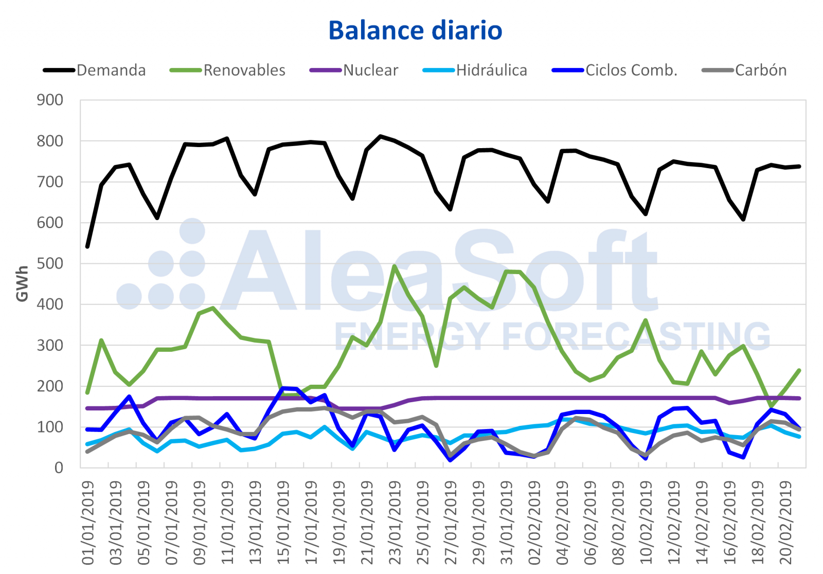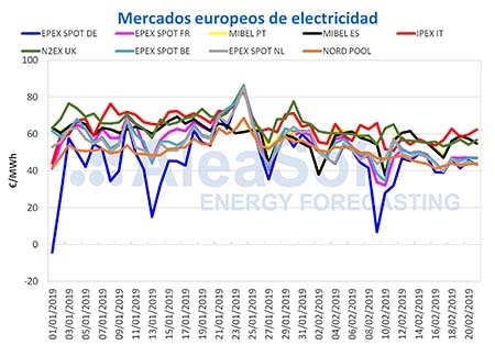 Por otra parte, los futuros para marzo de este año de Francia y Alemania en el mercado EEX esta semana han frenado la tendencia a la baja y se han estado negociando alrededor de los 44 €/MWh y 41 €/MWh respectivamente. En la sesión de ayer 20 de febrero los futuros de Francia cerraron en 44,76 €/MWh y los de Alemania en 41,30 €/MWh.