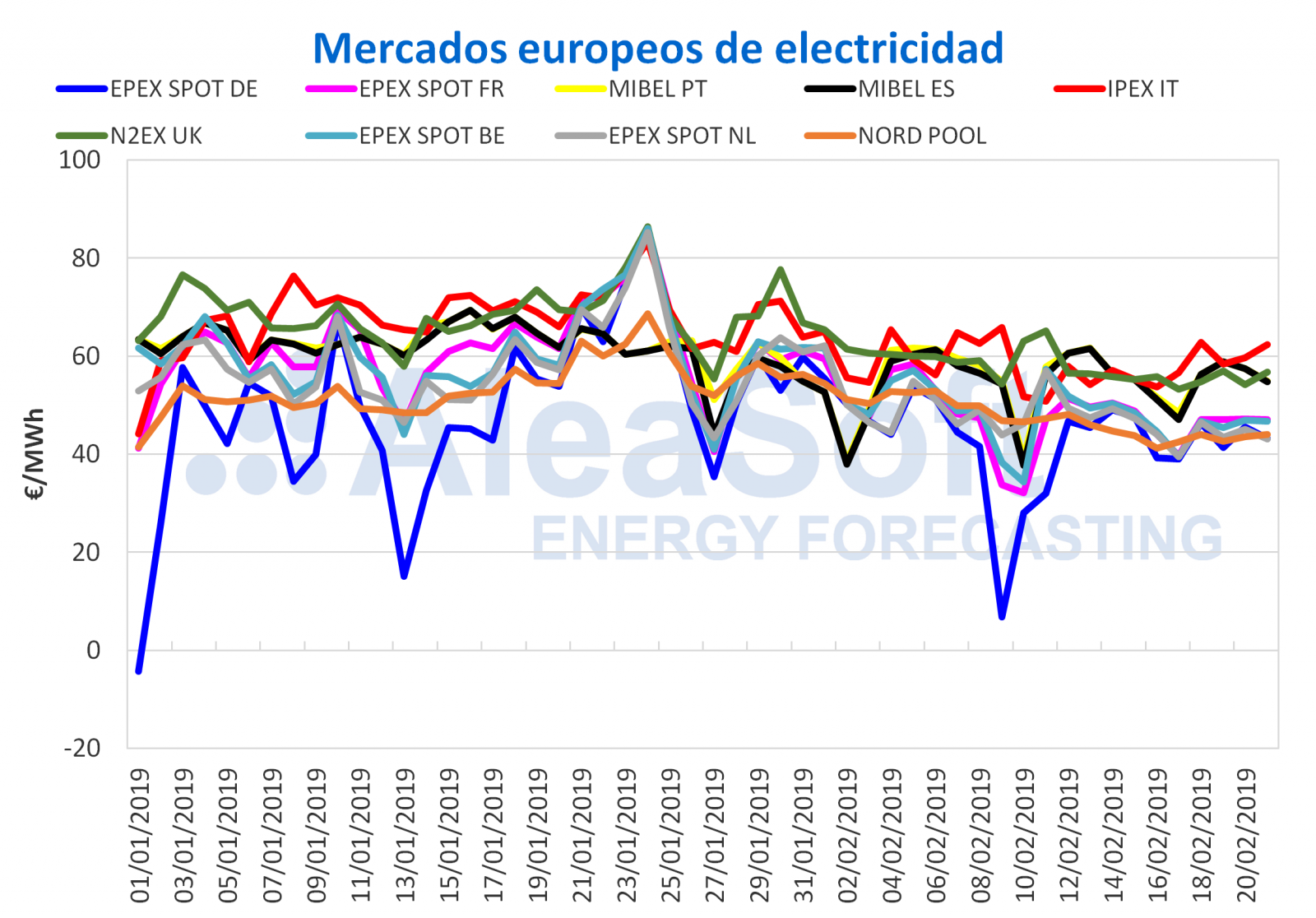 Esta semana del 18 de febrero el mercado de electricidad MIBEL de España y Portugal, aunque ha continuado bajando los precios, se mantiene en el grupo de mercados con precios más altos de Europa. El precio promedio de Portugal de los primeros cuatro días de esta semana, del 18 al 21 de febrero, de 56,90 €/MWh, ha sido 3,8% inferior que el precio promedio de los días equivalentes de la semana pasada, y ligeramente superior que el de España, de 56,86 €/MWh, que ha sido 3,1% más bajo que el promedio de los días homogéneos de la semana pasada.