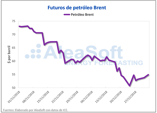 El precio del carbón europeo API2 para el mes de febrero cayó por debajo de lo $86 por tonelada el pasado 27 de diciembre, un precio tan bajo no ocurría desde el 4 de diciembre, y desde entonces no ha recuperado el nivel anterior. Mientras que el gas europeo TTF y el petróleo Brent se recuperan tímidamente después de tocar fondo: el gas en 21,98 €/MWh el 31 de diciembre, y el Brent en $52,73 por barril el 27 de diciembre. Para el Brent, este podría ser el comienzo de la recuperación del precio prevista para el primer trimestre del año, según los países productores que esperan que el precio se recupere entre un 20% y un 30% durante el primer trimestre de 2019 a raíz de los acuerdos para reducir la producción y estabilizar los precios.